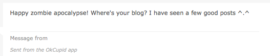 In summary: Some people got it. Most clearly didn't. And of those that got it, I'm fairly certain most of them were still expecting to hit it off with me. One of the above messages I sincerely hope is another troll, but as is evidenced by the rest of this blog, you can never really tell with the online dating crowd.